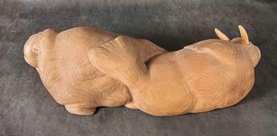 Скульптурное изображение двух моржей, лежащих вплотную друг к другу. Один морж лежит на животе, голова смотрит вперед, ласты поджаты под туловище. Второй - позади первого, лежит на спине, левый передний ласт - на животе, правый вытянут вдоль бока, хвост - на спине первого моржа, бивни торчат вверх. Скульптура сохраняет естественный цвет дерева, фактура гладкая.
