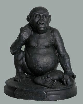 Скульптурное изображение сидящего гориленка на подножии. Поза - сидя, правая нога согнута коленом вверх, стопа стоит на земле. Левая согнута в колене, выдвинутом наружу, лежит на земле. Левая рука опущена, правая - согнута, кисть лежит на плече у шеи. Голова слегка повернута влево. На подставке из того же материала, с которой составляет одно целое. Скульптура тонирована в черный цвет.