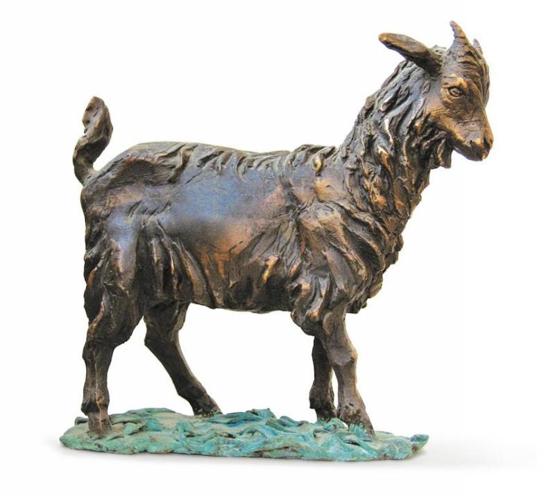 Скульптурное изображение молодого козла на подставке. Животное стоит, чуть выставив вперед правую переднюю ногу. Уши разведены в стороны, рога небольшие, глаза открыты. Хвост поднят вертикально вверх. Фактура шерсти козла передана рельефом. Подставка в виде земли с листьями растений, покрыта зеленой патиной.