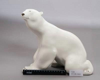 Скульптурное изображение сидящего белого медведя без подножия. Животное сидит, подняв голову и чуть повернув ее налево. Левая передняя нога слегка выступает вперед, правая немного позади. Левая задняя нога опирается коленом о землю, правая прижата к боку. Медведь белого цвета; мочка носа, глаза, когти и углы рта - черные.