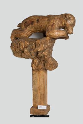 Скульптурное изображение бурого медвежонка на подножии в виде дерева. Верхняя часть подставки выполнена в виде кроны лиственного дерева, нижняя - в виде столба с квадратным в сечением. Фактура листьев передана углубленным рельефом (резьбой). В нижней части столб расширяется. На подножии в виде кроны сверху лежит, опираясь коленями и локтями, медвежонок. Голова его касается правой передней лапы, взгляд направлен вниз. Передняя часть тела и голова животного повернуты налевои назад, уши насторожены, глаза открыты. Левая задняя лапа не касается подножия. Скульптура вырезана из единого ствола дерева.