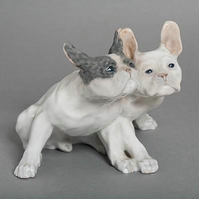 Скульптурное изображение двух французских бульдогов (кобель и сука). Поза - сидя, соприкасаясь боками, кобель справа. Передние лапы обоих широко расставлены, левая передняя лапа суки отставлена далеко назад, касаясь ее левой задней лапы. Туловища наклонены вперед, шеи вытянуты, смотрят вперед. Хвост кобеля закинут влево, суки - вправо. Собаки белого цвета, у кобеля уши, виски и области вокруг глаз серого цвета с тонкими более темными полосками. Носы розовые, глаза темные.