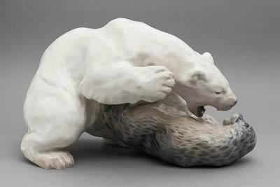 Скульптурное изображение белого медведя и нерпы без подножия. Поза медведя - стоя, полуприсев на задние лапы, широко расставленные, передняя правая лапа поднята, передняя левая упирается в грудь нерпы. Голова наклонена, пасть раскрыта. Нерпа лежит на спине, голова повернута вправо, рот раскрыт, хвост упирается в грудь медведя, передние ласты прижаты к бокам. Подглазурная роспись: медведь белый с сероватым оттенком, нос и пасть - темно-серого цвета; нерпа серая с более темными серыми пятнами.