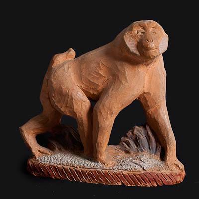 Скульптурное изображение макака на подножии. Поза - идущий на четырех конечностях, левая передняя впереди, левая задняя - позади, правые конечности вместе, соприкасаются: стопа и кисть поставлены параллельно друг другу, вплотную. Голова повернута вправо, хвост поднят, лежит на спине. Скульптура составляет с подставкой одно целое, подножие изображает землю с пучками травы. По краю подставки идет рельеф в косой рубчик. Скульптура терракотового цвета, торец подставки тонирован красновато-коричневым, земля - светло-серая, трава светло-фиолетовая.