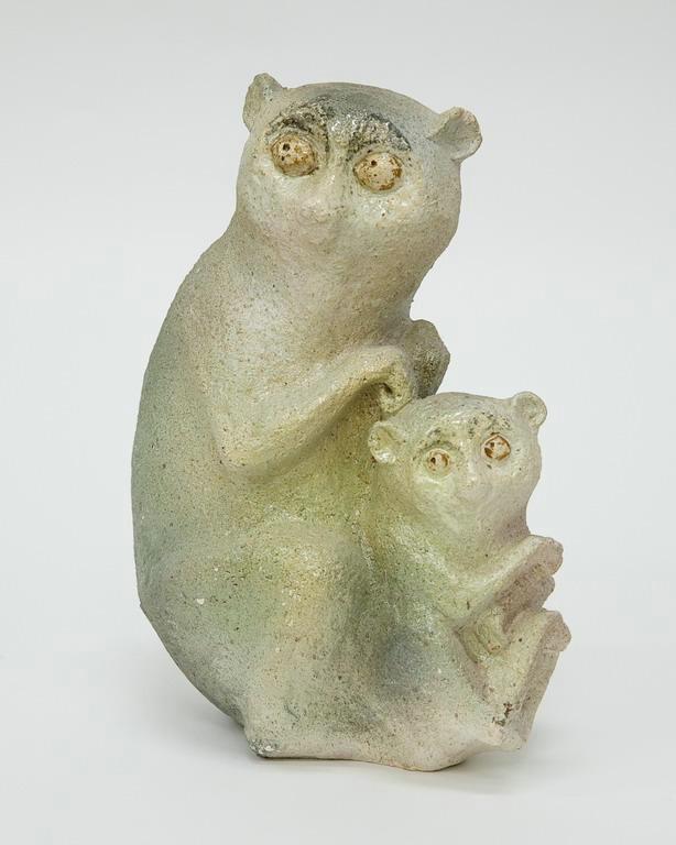 Скульптурное изображение лори с детенышем без подножия. Поза - сидя, голова на 90 градусов повернута вправо, задние ноги согнуты, передние конечности на уровне груди; спереди - детёныш, сидя спиной к матери, голова повернута вправо, передние и задние конечности согнуты впереди. Скульптура светлого зеленовато-серого цвета, глаза желтые, верх головы взрослого темный.