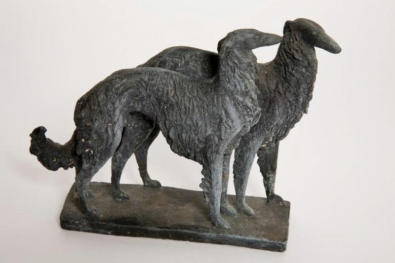 Скульптурное изображение двух собак породы русская псовая борзая на прямоугольном подножии, с которым они составляют одно целое. Собаки соприкасаются боками. Поза обеих собак - стоя. У собаки, стоящей слева, передняя левая лапа впереди, задняя левая впереди, голова повернута вправо. У собаки, стоящей справа, передние и задние лапы стоят параллельно друг другу, голова повернута влево. Хвосты опущены. Фактура шерсти собак передана при помощи рельефа.