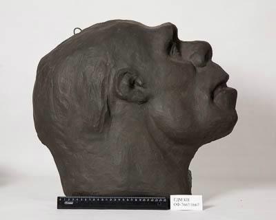 Скульптурная реконструкция головы неандертальца в профиль вправо. Голова крупная, свод черепа уплощен, лоб скошенный, надбровный валик хорошо развит, глаза посажены глубоко, нос крупный, нижняя челюсть массивная без подбородочного выступа. Рот слегка приоткрыт. Ухо округлое. Волосы не обозначены. Скульптура тонирована в темно-коричневый цвет. На голове сверху видна металлическая петля для подвешивания.