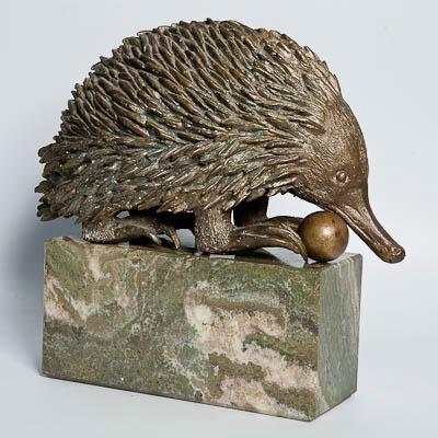 Скульптурное изображение ехидны с яйцом на подставке из поделочного камня зеленоватого цвета. Ехидна стоит, уткнувшись носом в землю, глаза раскрыты. Между передних лапок зверя лежит шарообразное яйцо, которое животное придерживает своей мордой. (Яйцо не прикреплено к скульптуре). На всех лапках длинные когти. На голове и лапах ехидны рельефом показана фактура шерсти. Спина и бока зверя покрыты длинными иглами.