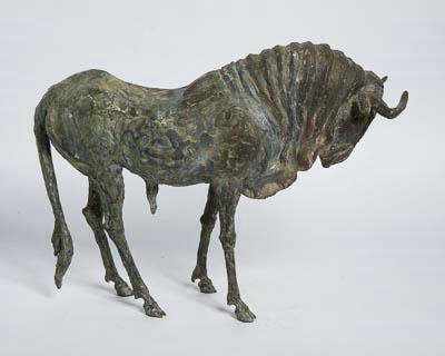 Скульптурное изображение стоящего самца антилопы гну без подножия. Обе левые конечности немного отставлены назад. Шея изогнута, голова наклонена вперед и чуть-чуть повернута влево. Небольшие рога направлены вперед. Хвост опущен вертикально вниз. Данная скульптура идентична работе "Антилопа гну" ОФ-8739 (С-66), единственное отличие - первая работа с подставкой из камня.
