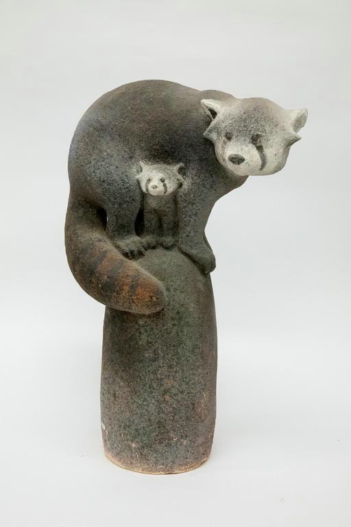 Скульптурное изображение малой панды с детенышем на подножии. Поза - сидя на подставке в виде закругленного сверху столба. Голова повернута на 90 градусов вправо, хвост загнут вправо. Под брюхом взрослого зверя находится детеныш, голова смотрит в правую сторону, слева виден хвост, свесившийся вдоль столба. Скульптура окрашена в темно-серый цвет, хвост - красновато-коричневый с темными поперечными полосами, морды зверей светлые с темными полосами, идущими от глаз вниз, а также черными глазами и носами. Подставка составляет со скульптурой единое целое, внутри полая, темно-серого цвета снаружи.