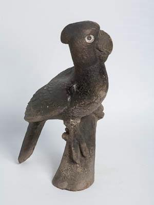 Скульптурное изображение сидящего черного какаду на подножии в виде камня. Крылья сложены и прижаты к туловищу, голова слегка повернута влево. Правая нога находится ниже левой на подставке. Хохолок прижат к голове. Птица темно-серого цвета, глаза белые с черными зрачками. Скульптура составляет с подножием одно целое.