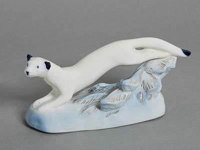 Скульптурное изображение бегущего горностая на подножии. Зверек опирается передними лапами о землю, задние лапы и хвост касаются еловых лап, стелющихся по подставке сзади. Голова горностая на длинной шее слегка повернута налево, взгляд направлен вверх. У зверя синим кобальтом покрашены кончик хвоста, уши, глаза и нос. Подставка и ветки ели тонированы светло-голубым. На хвойных лапах позолотой нарисованы длинные иголки, а также еловые шишки.