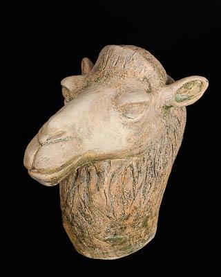 Скульптурное изображение головы верблюда на длинной вертикально поставленной шее. Глаза открыты, уши насторожены. Фактура шерсти передана углубленным рельефом. Уши изнутри и рельеф шерсти подкрашены зеленовато-коричневой краской, гладкие поверхности - охристо-белые.
