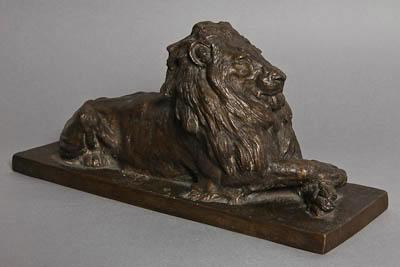 Скульптурное изображение лежащего льва на прямоугольном металлическом подножии. Голова поднята вверх и поставлена прямо, передние лапы вытянуты вперед и скрещены: левая снизу лежит ребром, а правая сверху. Хвост подогнут слева. Скульптура составляет с подножием единое целое, полая изнутри.