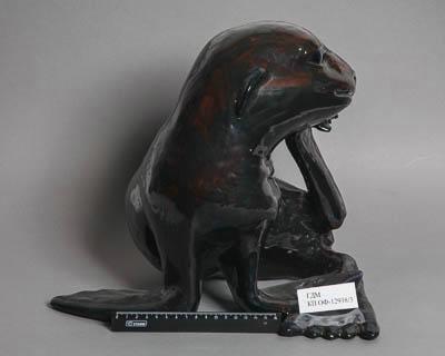 Скульптурное изображение детёныша морского котика без подножия. Животное сидит, повернув голову налево, глаза раскрыты. Передние ласты разведены в стороны, правый задний ласт лежит на земле, а левый поднят вертикально вверх и касается головы котика. На поднятом вверх заднем ласте у конца пальцы полусогнуты, три продольных углубления на поверхности ласта обозначают кости пальцев. Скульптура покрыта блестящей глазурью иссиня-черного цвета, глаза синие.