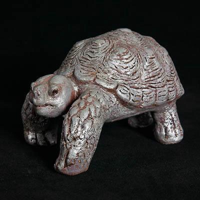 Скульптурное изображение сухопутной черепахи без подставки. Рептилия идет, выставив левую переднюю ногу вперед. Голова слегка повернута налево. На панцире выступают 9 бугорков: один в центре, остальные по кругу. Фактура морщинистой кожи и панциря передана рельефом, подчеркнутым окраской: углубления коричневого цвета, а выступающие части покрашены серебристой краской.