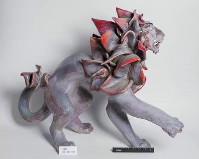 Скульптурное стилизованное изображение льва без подножия. Животное стоит, вытянув вперёд и держа на весу правую переднюю лапу. Скульптура стоит, опираясь на 3 точки: левую переднюю и обе задние ноги. Голова поднята вверх и слегка повернута налево. Пасть открыта и оскалена, хвост С-образно изгибаясь поднят вверх, его конец прижат к правому заднему бедру. Грива и кисточка на конце хвоста вылеплены в виде крупных лепестков с острыми краями. Лев светло-сиреневого цвета, а грива и конец хвоста ближе к краям становятся красными.
