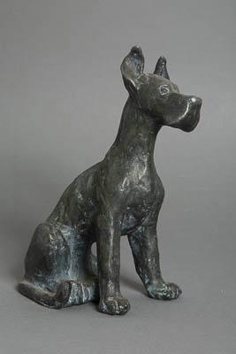 Скульптурное изображение молодой собаки породы дог без подножия. Поза - сидя, передние лапы на одном уровне, расставлены в стороны. Зад слегка завален на левый бок, хвост изогнут вправо, прижат к правой задней лапе, спина немного изогнута. Голова смотрит прямо, чуть-чуть наклонена на левый бок, уши стоят.