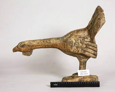 Скульптурное изображение глухаря на подножии, вырезанное из единого куска дерева. Глухарь стоит, вытянув вперед голову на длинной шее, хвост раскрыт веером и поднят вверх. Крылья прижаты к бокам, ноги поставлены параллельно. Фактура оперения передана углубленным рельефом (резьбой).