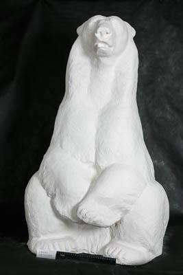 Скульптурное изображение сидящего белого медведя без подставки. Голова поднята вверх, взгляд направлен вперед, пасть слегка приоткрыта. Задние лапы согнуты в коленях и поджаты, передние опущены вниз, локтями опираются об колени, левая передняя лежит поверх правой.