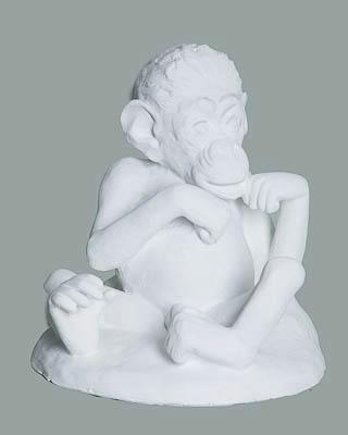 Скульптурное изображение сидящего новорожденного детеныша шимпанзе на подножии. Поза - сидя, сильно откинувшись назад. Ноги полусогнуты в коленях, правая лежит на земле, левое колено немного приподнято. Пальцы стоп полусогнуты. Руки согнуты в локтях, кисть правой касается груди, левой - согнута в кулачок и касается подбородка. Голова повернута влево, глаза открыты. На подставке из того же материала, с которой составляет одно целое.