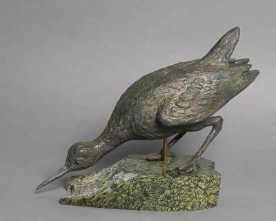Скульптурное изображение кулика на подставке из декоративного камня зеленоватого цвета. Поза - на согнутых конечностях, туловище наклонено вперед, хвост поднят, голова опущена, клюв почти касается земли. Скульптура тонирована черным. Кулик закреплен на подставке-камне при помощи металлического штыря, идущего вертикально вниз от брюшка птицы.