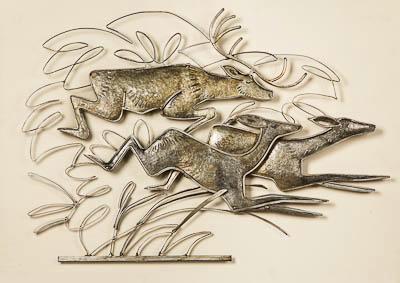 Стилизованное рельефное изображение трех оленей, закрепленное на прямоугольном деревянном основании, покрашенном белой краской. Силуэты животных вырезаны из листа металла и покрыты чеканкой, изображающей фактуру шерсти. Изображены три бегущих оленя - впереди внизу - две безрогие самки, сзади вверху - рогатый самец. Контуры животных и рога сделаны из полосок металла, также, как и силуэтное обобщенное изображение растительности. Внизу широкой полосой намечена линия земли, к которой прикреплены кусты и травы.