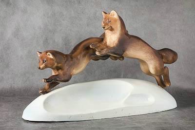 Скульптурное изображение двух бегущих соболей на подножии в виде сугроба. Звери показаны в прыжке: первый соболь касается поверхности снега правой передней лапой, а второй - правой задней. Все остальные конечности животных находятся в воздухе. Подставка, изображающая сугроб, белого цвета. Соболя окрашены в коричневый цвет - брюхо и грудь светлые, спина темная.