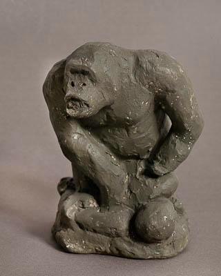 Эскиз к скульптуре "Горилла в ярости" (ОФ 7667/1640), изображающий гориллу, напавшую на человека. Животное стоит, попирая лежащего на спине человека. Ноги человека согнуты в коленях и скрещены. Пасть гориллы раскрыта. Лепка свободная, детали не проработаны. Подножие скульптуры неправильной формы.