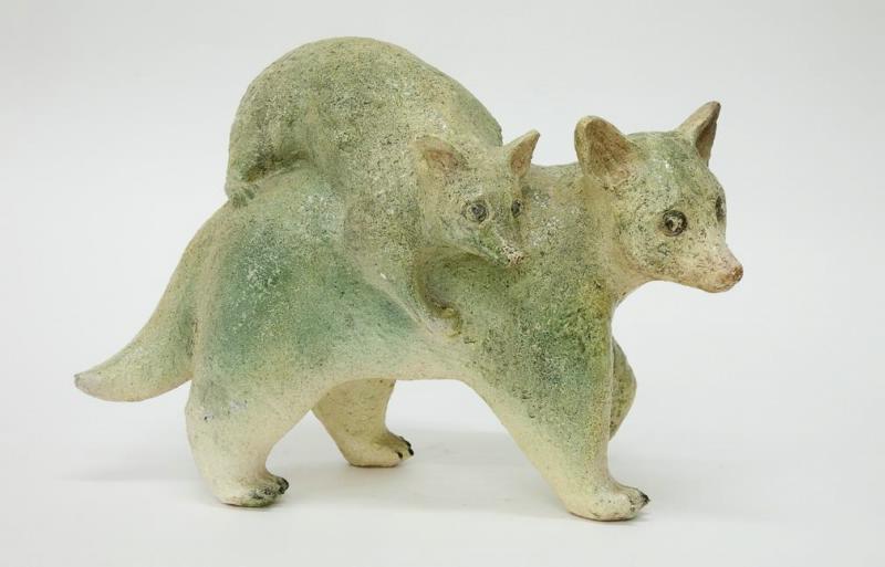 Скульптурное изображение поссума с детенышем без подставки. Поза - стоя, левая задняя нога немного выдвинута вперед, левая передняя приподнята и согнута в запястье, голова слегка повернута вправо, хвост опущен. На спине находится детеныш, он немного свешивается головой с правого бока взрослого, а хвостом - с левого. Скульптура покрыта светлым зеленовато-серым красителем. Когти черные, нос и внутренние стороны ушных раковин - бледно-розовые, поверх красителей - глазурь.