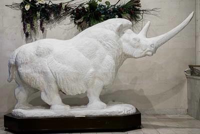 Скульптурная реконструкция вымершего вида носорога. Поза - стоя, передние конечности на одной линии, задняя левая отставлена назад. Голова с двумя рогами поднята вверх и слегка повернута вправо. Фактура длинной шерсти передана рельефом. На подставке из того же материала, с которой составляет единое целое.