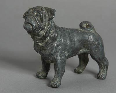 Скульптурное изображение собаки породы мопс без подножия. Поза - стоя, передние и задние конечности параллельно друг другу, хвост, закрученный колечком, лежит на спине. Голова поднята вверх и слегка повернута влево.