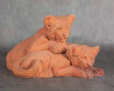 Скульптурное изображение двух львят. Один из них лежит, положив голову на передние лапы, хвост прижат к правому заднему бедру. Второй львенок сидит возле его левого бока, положив на него правую переднюю лапу. Хвост прижат к левому бедру. Глаза львят открыты, уши насторожены, взгляды направлены в одну сторону. Скульптура терракотового цвета.