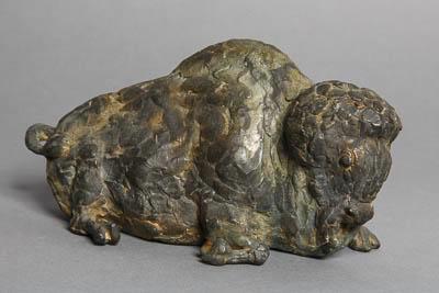 Скульптурное изображение лежащего зубра без подножия. Поза - лежа, левая передняя конечность выставлена вперед, остальные подогнуты. Голова чуть повернута вправо, хвост закинут на правое заднее бедро.
