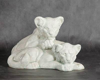 Скульптурное изображение двух львят. Один из них лежит, положив голову на передние лапы, хвост прижат к правому заднему бедру. Второй львенок сидит возле его левого бока, положив на него правую переднюю лапу. Хвост прижат к левому бедру. Глаза львят открыты, уши насторожены, взгляды направлены в одну сторону. Скульптура покрыта глазурью голубовато-белого цвета.