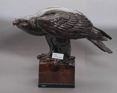 Скульптурное изображение беркута на кубической подставке. Беркут стоит, вытянув вперед шею параллельно земле, голова повернута налево. Глаза птицы желтые с черным зрачком. Крылья сложены и прижаты к бокам, хвост несколько опущен вниз. Скульптура составляет с подставкой одно целое. Беркут темно-коричневого цвета, клюв, когти и подставка - немного светлее.