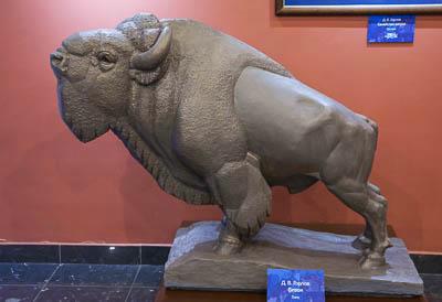 Скульптурное изображение стоящего бизона на подножии. Животное стоит, слегка повернув рогатую голову налево. Все конечности поставлены параллельно друг другу. Передняя часть прямоугольного в плане подножия слегка повышается. Задняя часть тела бизона гладкая, а голова, шея, плечи и грудь покрыты густой гривой. Фактура шерсти передана рельефом. Скульптура тонирована под бронзу.