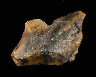 Отщеп. Кремень (?) чайного цвета, полупрозрачный на просвет, заполнен многочисленными чёрными дендритообразными включениями.
