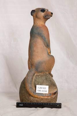 Скульптурное изображение сидящего суриката на подножии в виде камня. Животное сидит, вытянувшись вертикально. Голова повернута направо, большие глаза широко открыты. Передние лапки сложены на животе, правая поверх левой. Задние лапки поставлены параллельно на камень-подножие. Хвост лежит на подножии, загнут вправо и вперед. Подставка серого цвета, сам сурикат - терракотового цвета, спина сзади и хвост - серые. Уши, глаза и нос - черные. Скульптура составляет с подножием одно целое.