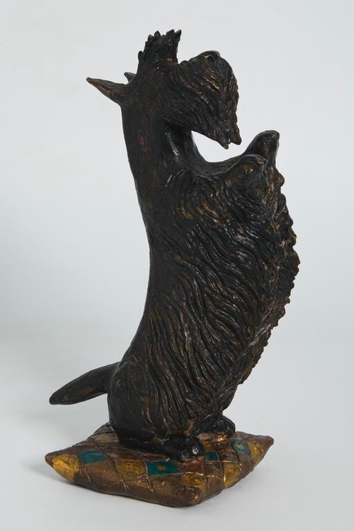 Скульптурное изображение собаки породы скотч-терьер, стоящей вертикально на задних лапах на подножии в виде подушки. Челка торчит вверх, глаза открыты, уши насторожены. Передние лапы вытянуты вверх, хвост опущен вниз. Шерсть собаки передана рельефом. Подушка покрыта ромбическим узором, причем некоторые ромбы покрашены желтой и зеленой краской. Собака черного цвета.