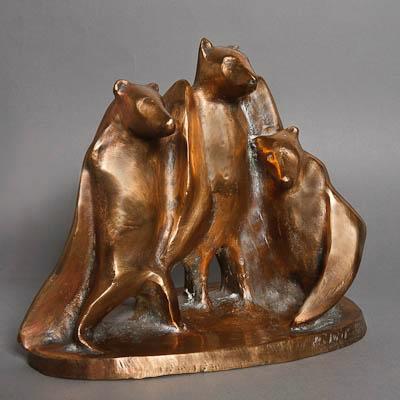 Скульптурное изображение трех летучих собак на подножии. Животные изображены стоящими вертикально на задних ногах. Центральная летучая собака стоит прямо, а две другие словно бы припадают к ней. Животное справа выставило вперед левую ногу, крылья опущены. Летучая собака слева опирается на выставленное вперед левое крыло. Все формы скульптуры обтекаемые, гладкие.