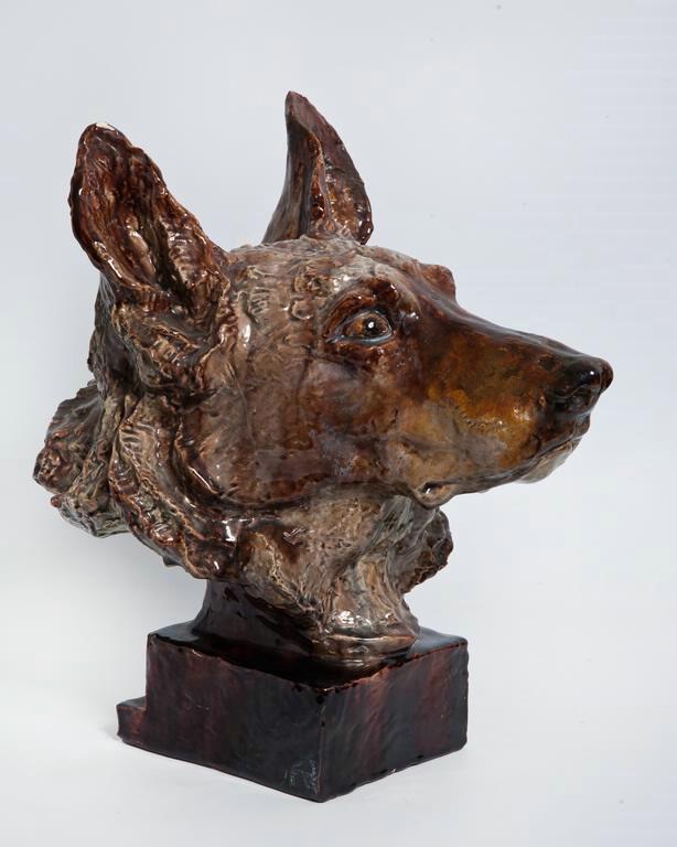 Скульптурное изображение головы собаки породы немецкая овчарка на прямоугольной подставке. Уши насторожены, глаза открыты, взгляд направлен вперед. Шерсть передана рельефом. Скульптура покрыта поливой: коричневато-серой на голове собаки, темно-коричневой на подставке. Глаза желтые с черными зрачками.