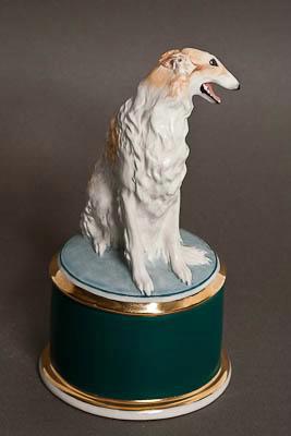 Таберка круглой формы. На крышке - скульптурное изображение сидящей борзой (окрас шерти светлый с розовато-палевыми разводами, сама крышка небесно-голубого цвета, табакерка густого сине-зелёного цвета). На крышке и у основания табакерки золотые (позолота) ободки. Поза собаки статичная, напржённая. Голова повёрнута в сторону на 1/4. Пасть приоткрыта. Создаётся ощущение, что собака присела после стремительного бега и тяжело дышит.