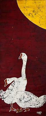 Изображены два гуся на тёмно-бордовом фоне. Справа вверху изображена 1/4 от диска Луны (фрагмент желточного цвета). Это очень раннее утро. На этом тёмно-бордовом фоне предстают два снежно-белых гуся. Тот, что на переднем плане, изображён стоя в профиль, шея S-образно изогнута. Птица смотрит влево. Вотрой гусь представленный за тем, что на переднем плане, изображён в полупрофиль стоя, с высоко-поднятой головой, шея вытнута вертикально вверх. Голова изображена в полупрофиль. Клювы и лапки обеих птиц такого же цвета, что и фон полотна, но они с ним не сливаются за счёт того, что обведены белым контуром.