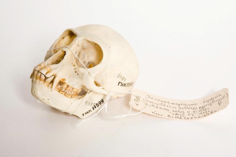 Костный материал. Череп верветы (зелёной мартышки). Cercopithecus aethiops. Классификация: Хордовые Chordata, Позвоночные Vertebrata, Млекопитающие Mammalia, Приматы Primates, Мартышковые Cercopithecidae, Cercopithecinae, Верветка Chlorocebus pygerythrus (F. Cuvier, 1821)