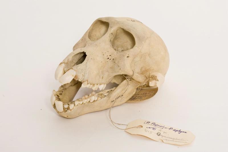 Костный материал. Череп павиана. Papio sp. Классификация: Хордовые Chordata, Позвоночные Vertebrata, Млекопитающие Mammalia, Приматы Primates, Мартышковые Cercopithecidae, Cercopithecinae, Павиан Papio sp.