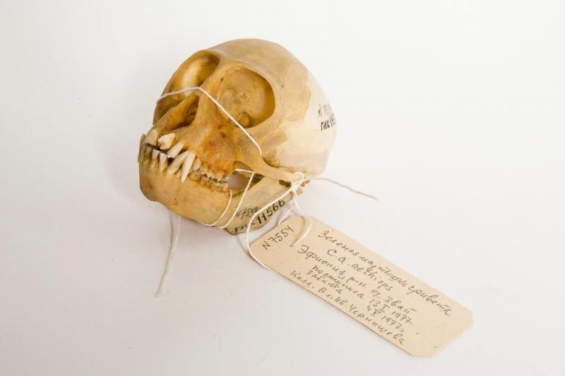 Костный материал. Череп гриветы (зелёной мартышки). Cercopithecus aethiops. Классификация: Хордовые Chordata, Позвоночные Vertebrata, Млекопитающие Mammalia, Приматы Primates, Мартышковые Cercopithecidae, Cercopithecinae, Гривет Chlorocebus aethiops aethiops (Linnaeus, 1758)
