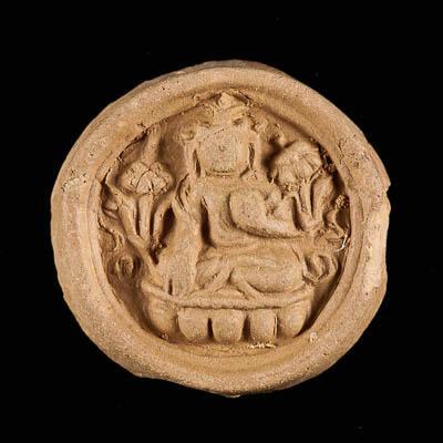Молитвенная монета малая (?) изготовленная методом штамповки из глины. Дискообразной формы, с прибоднятыми бортиками. В центре выступающее изображение бодхисатвы, сидящего со скрещенными ногами. Левая рука бодхисатвы прижата к груди, а правая лежит на правом колене. Под подиумом бодхисатвы на ребре диска-выбоина (вероятнее всего технологический брак).