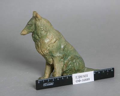 Скульптурное изображение сидящей собаки породы колли без подножия. Глазурь зеленоватого цвета.