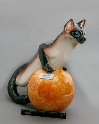 Скульптурное изображение стоящей кошки, опирающейся передними лапами на шар. Передняя часть туловища приподнята, голова кошки поднята вверх, глаза открыты, уши насторожены. Глаза синие с большими черными круглыми зрачками, взгляд направлен вперед. Передние лапы прижаты к бокам и опираются на большой золотисто-желтый шар. Задние лапы отставлены назад и расставлены. Хвост С-образно изгибаясь, касается правой задней лапы, а концом касается шара. Спина кошки темно-коричневого цвета, на морде - темная "маска", передние лапы, хвост и концы задних лап - темно коричневые; живот, грудь, шея спереди - белая.